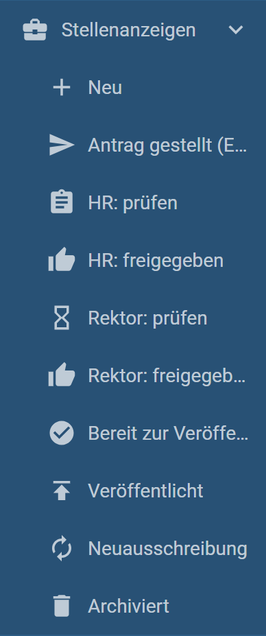 Die vom HR freigegebenen Stellen gelangen zur Prüfung in den Status „Rektor: prüfen“. Auf diesen Status haben nur die Admins und der Rektor Lese- und Verwaltungsrechte. Bei Freigabe wird die Stelle vom Rektor zum Status „Bereit zur Veröffentlicht“ verschoben, wo sich das HR um die Veröffentlichung der Stelle bei den gewünschten Kanälen kümmert. Die Planung der Veröffentlichung und Archivierung ist zeitlich möglich.